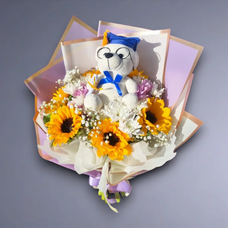 Celebra los logros académicos con este hermoso arreglo floral graduación, compuesto por vibrantes girasoles, delicadas flores blancas y un tierno peluche con birrete. Ideal para regalar en ceremonias o como detalle de orgullo y felicitación. Su diseño elegante y alegre transmite felicidad y reconocimiento, convirtiéndolo en el obsequio perfecto para graduados que merecen un recuerdo lleno de color, cariño y significado.