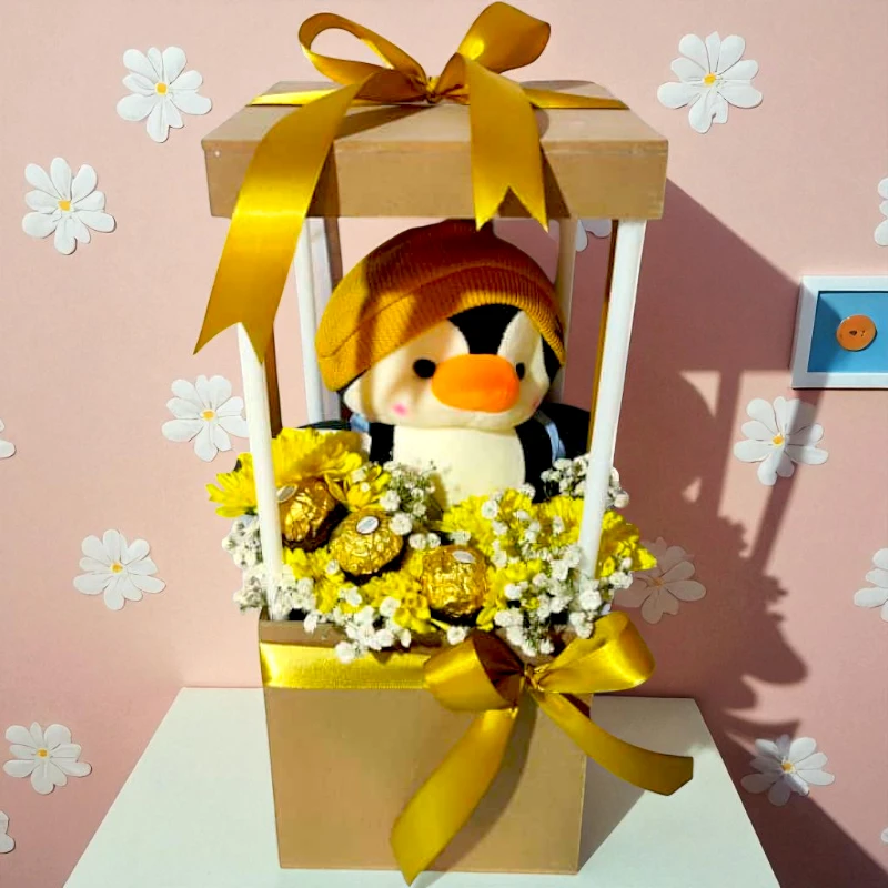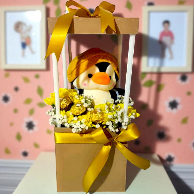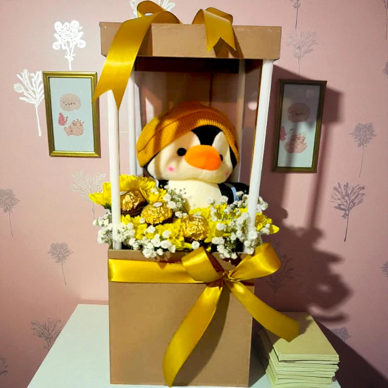 Cajita con peluche, 3 bombones y flores amarillas frescas, un detalle ideal para regalar en cumpleaños, aniversarios o cualquier ocasión especial. Sorprende con este arreglo único que combina ternura, dulzura y color en un solo presente.